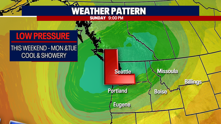 By Sunday, that low will settle in over Western WA, making for a cool and rainy day. Expect widespread scattered showers and rain along with a chance for thunderstorms.