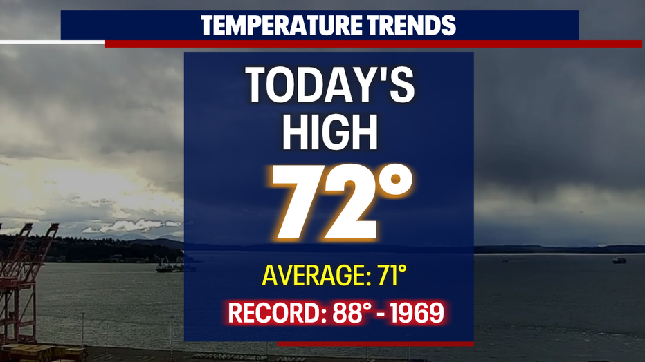 Temperatures around Seattle and the south warmed just above average into the low 70s today. The normal seasonal high for this time of year is 71 and jumps to 72 on Monday.