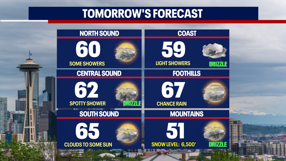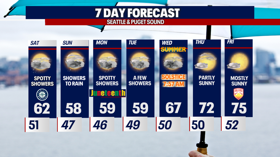 Father's Day highs will feel more like summer lows, only warming into the mid to upper 50s for Puget Sound.
