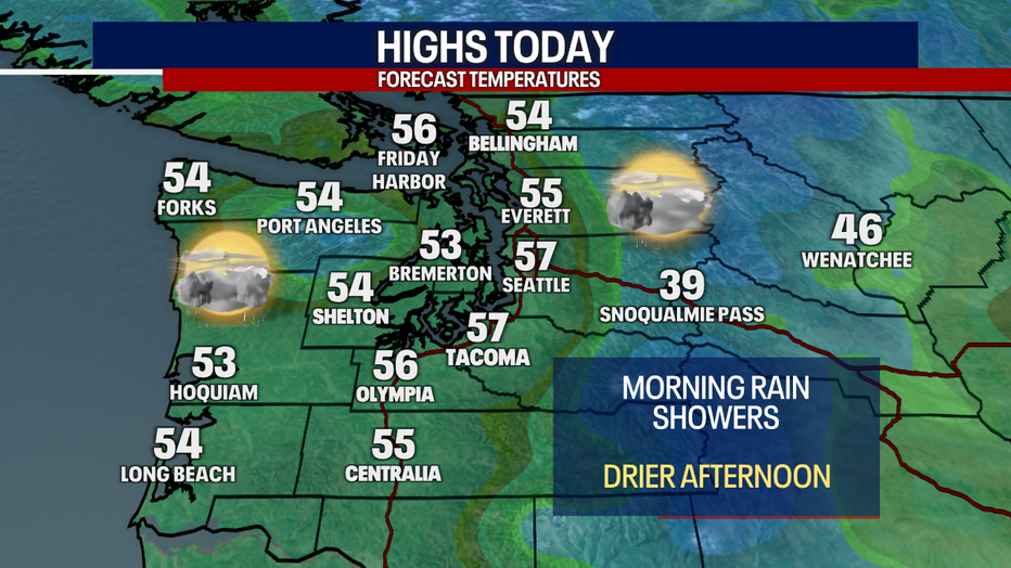 Light showers will continue for Western Washington Thursday morning. The second half of the day will be drier with some sunbreaks, and afternoon high temperatures in the mid 50s.