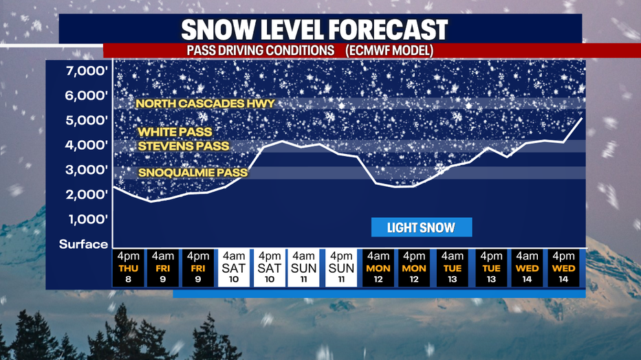 In the mountains, snow levels will rise to 4,000 feet this weekend, bringing a mix of rain/snow to Snoqualmie Pass and some accumulation at Stevens and White passes on Sunday. While the mountains will see snow at times the next seven days, we are not expecting a big storm anytime soon.