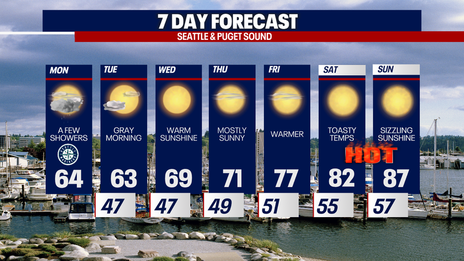 The big weather story is happening later this week as a strong ridge of high pressure builds over the Pacific Northwest. Temps will climb into the 70s Thursday and Friday with highs soaring into the 80s Saturday through Monday. This will be our hottest stretch of the year so far.