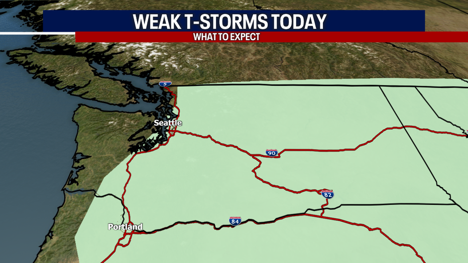 High temps will be in the mid 60s today, with the chance for a brief quick-hitting shower or even a weak thunderstorm. Those showers will be very isolated if we see anything west of the Cascades. Most of the action the next two days will be over the Cascades or east of the mountains.