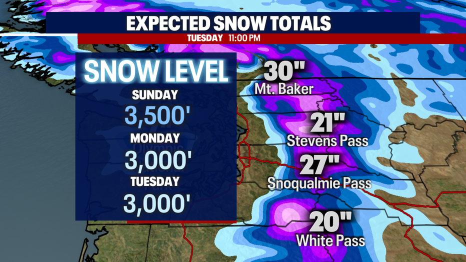 Between now and Tuesday the mountains get a nice refresher for the slopes as snow levels hang between 3,000' - 3,500'.