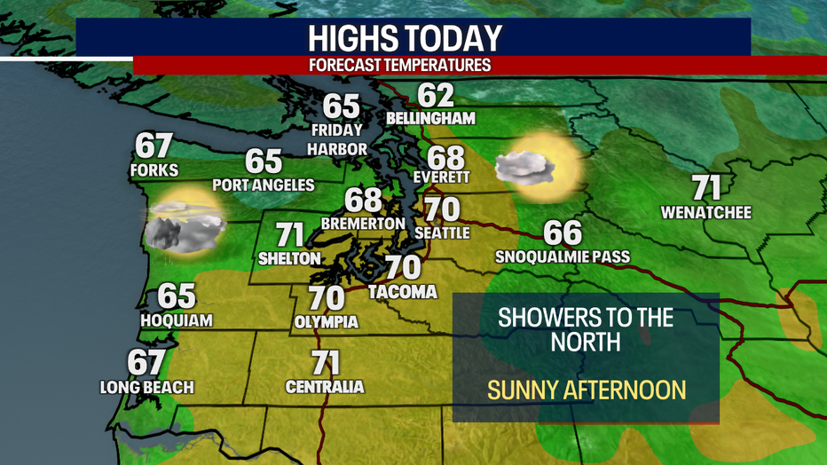 High temperatures will be approaching records in the central and south Puget Sound areas. The north sound will be cooler, due to more cloud cover and rain showers.