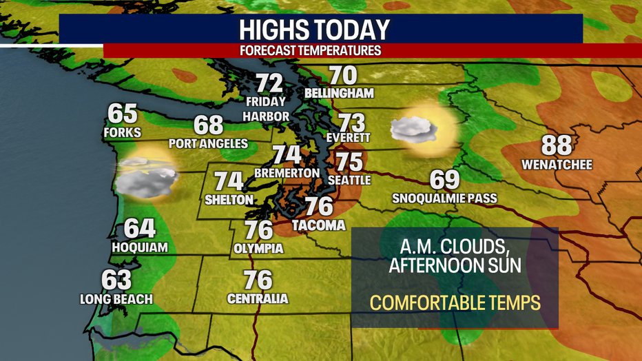 Seattle - Western Washington will continue with a pattern of morning clouds and afternoon sunshine the next few days with comfortable high temps in the 70s.