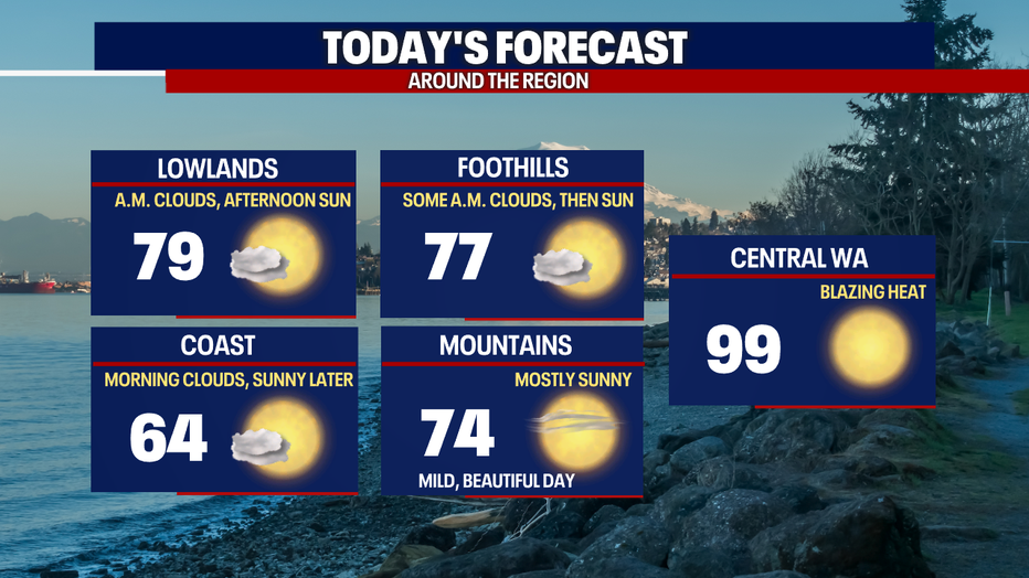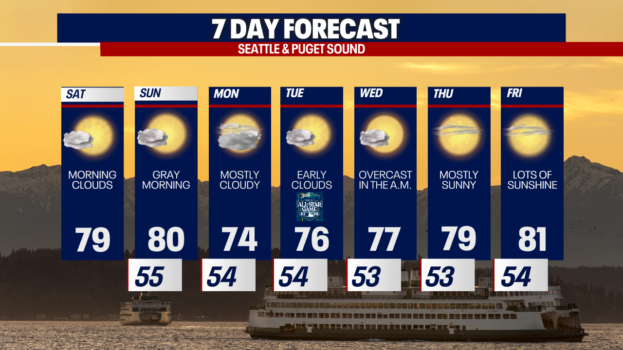 As you likely know, this is MLB All-Star Week in Seattle ahead of the big game on Tuesday! Thankfully, Mother Nature is cooperating nicely. If you're joining the festivities in the days to come, just keep a warm sweatshirt with you for the cool mornings. You won't need it by the afternoon. Soak up the sunshine!