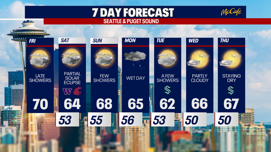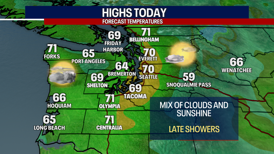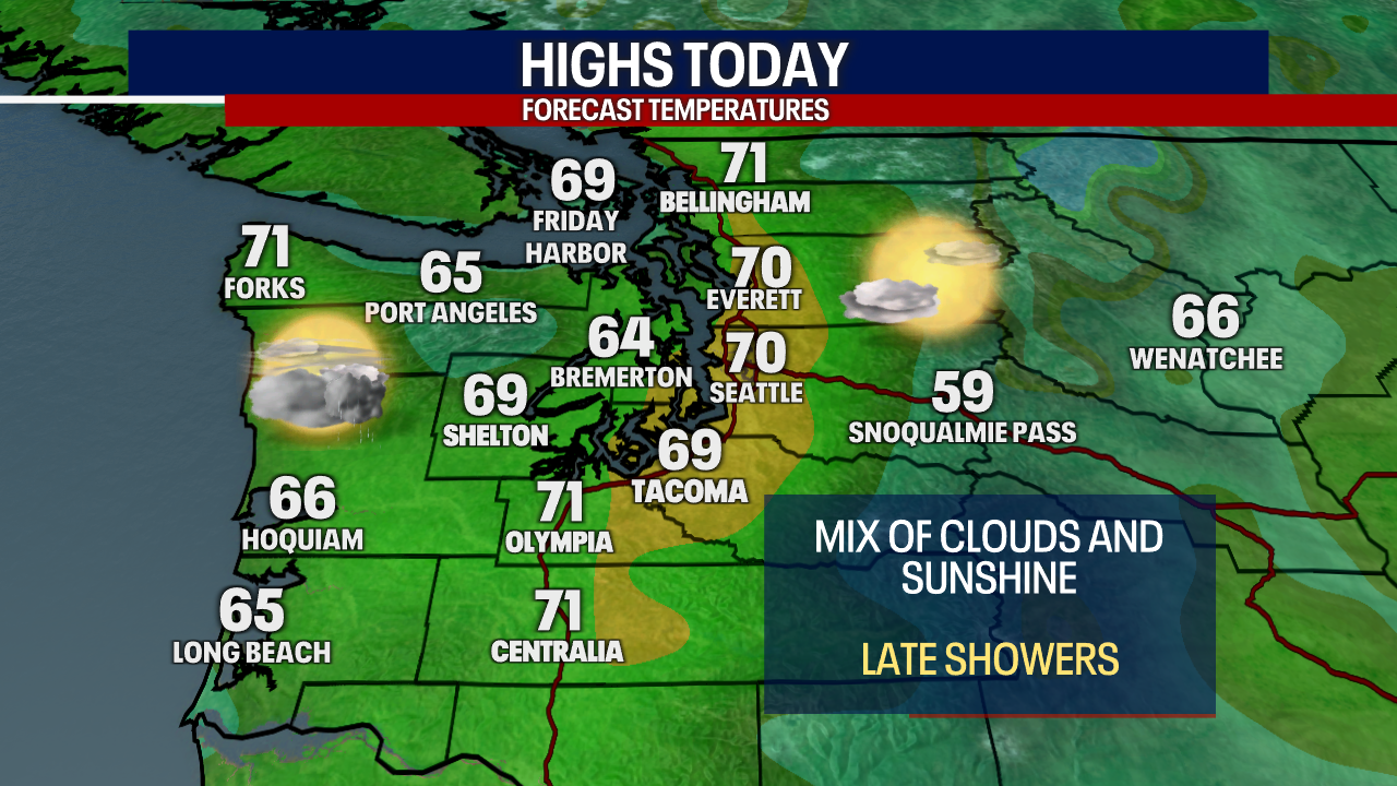 In the meantime, you'll enjoy warm temperatures and a mix of high clouds and sunshine. Highs will be around 70 degrees for most spots around the Puget Sound area.