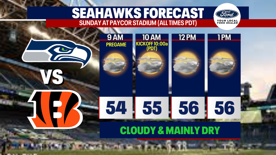 The Seahawks will be taking on the Cincinnati Bengals on Sunday at 10:00 AM (PDT). It will be mainly dry and cool for that game with cloudy skies.