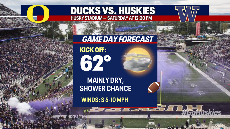 If you're heading to ESPN's College Gameday's appearance at UW's Red Square, expect a few light showers in the early morning hours. For tailgating and the big game against the Oregon Ducks, it should be mainly dry with temps in the 60s.