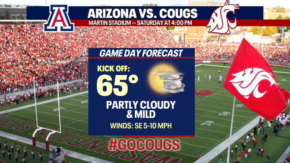 In Pullman, the Cougs are taking on the Arizona Wildcats. Temps will be very comfortable at kickoff, in the mid 60s, with increasing clouds.