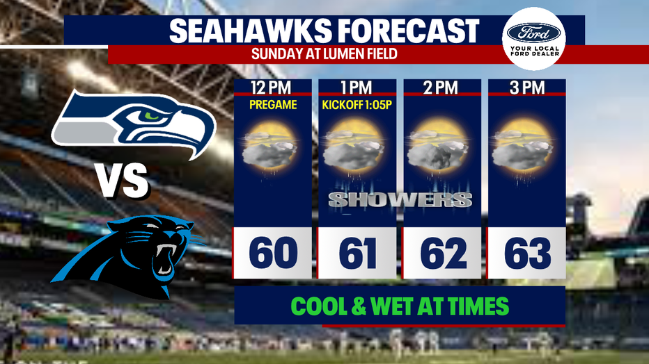 If you're heading to the Seahawks game on Sunday against the Panthers, be prepared for some wet weather. Showers are expected during the game with cool temps, in the low 60s.