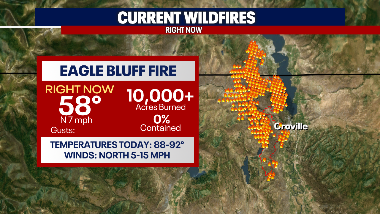 The Eagle Bluff Fire in Eastern Washington near Oroville has grown to over 10,000 acres with no containment. Temperatures will be in the low 90s Monday, but winds should be calmer along the Washington/Canada border.