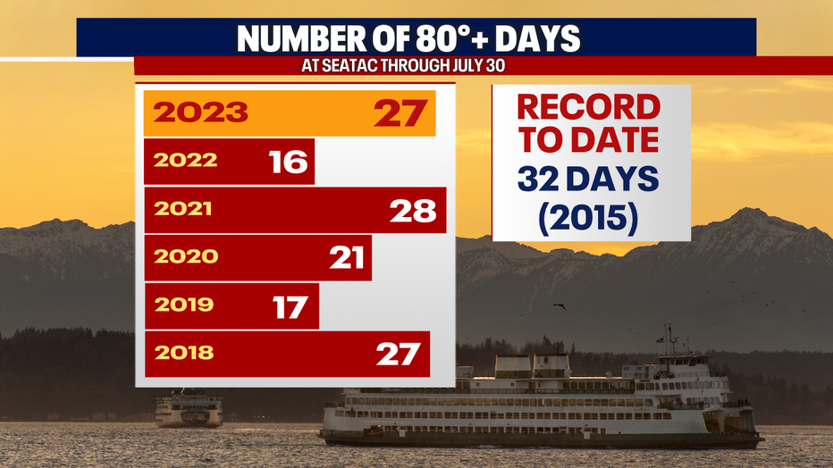Seattle has hit 80 degrees 27 times so far this year and we will add to that total this week. The record through July 30 is 32 days, set in 2015.