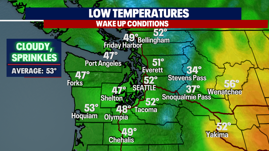 Overnight expect cloudy skies with temperatures in the upper 40s to low 50s. Some areas, like the Coast, North Sound, and Foothills may see a little drizzle.