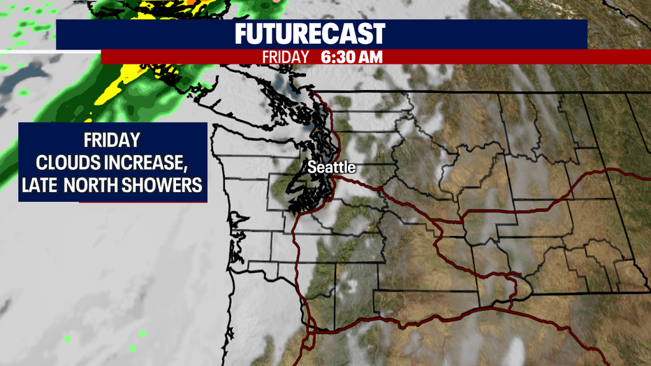 We're mainly dry Friday, but showers are on the way. Look for rain to move into the North Sound late Friday night. Highs cool Friday into the upper 60s.