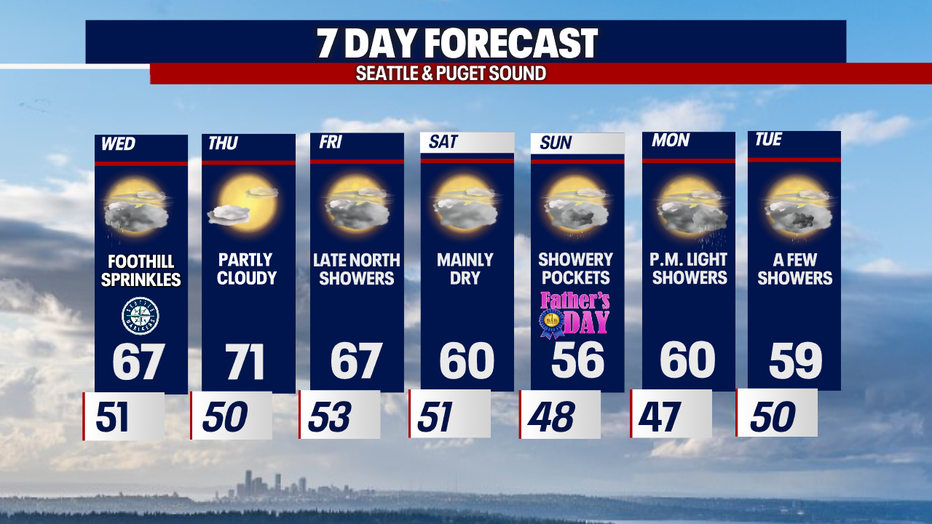 Highs Wednesday will run a few degrees warmer than Tuesday, but still fall short of average for the metro area. We're forecasting 67 for Seattle.