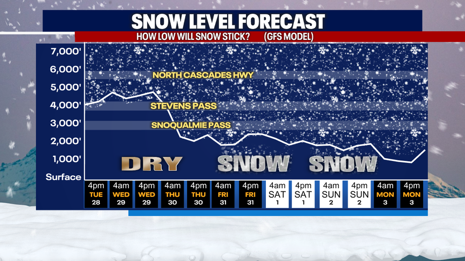 Snow levels will fall later this week and into the weekend, bringing more snow to the Cascade passes. There will be periods of heavy snow at times, so be prepared for winter driving if your travels take you over the mountains.