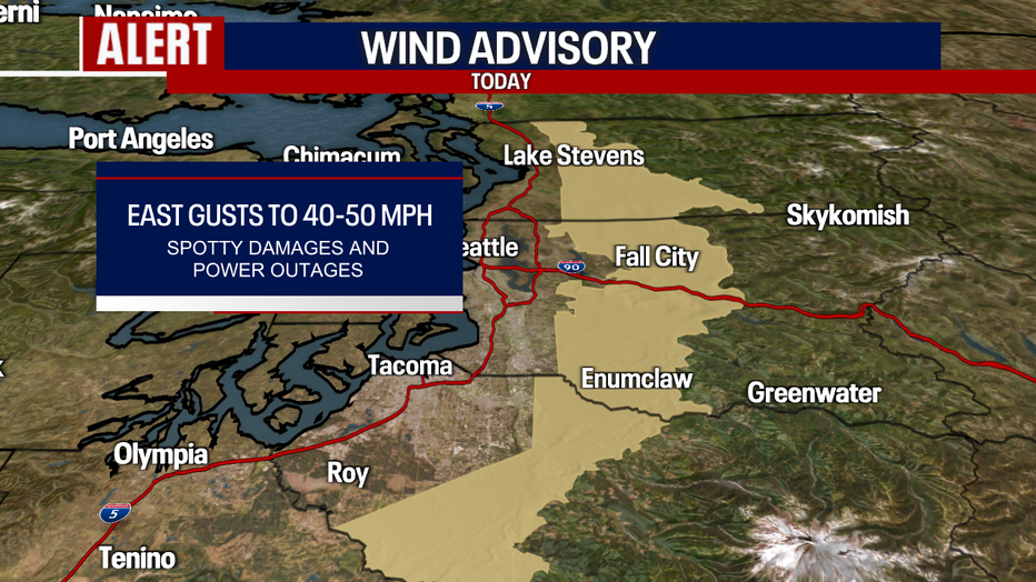 Strong east winds will blow through the Cascade gaps this morning and into the early afternoon hours. A Wind Advisory has been issued for these areas where gusts could reach 40 to 50 mph. Winds should die down later tonight.