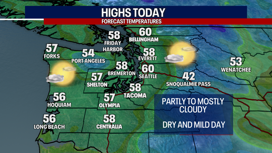 High temperatures will be back close to 60 degrees for much of the Puget Sound area. Expect more clouds south of Tacoma and more sunshine north of Seattle.