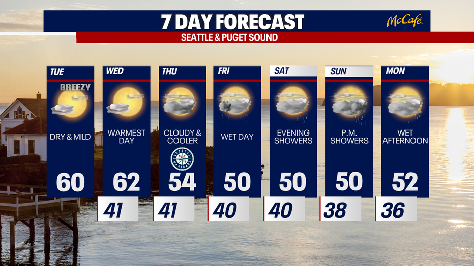 If you are heading to Mariners opening night Thursday, temps will be around 50 degrees by first pitch.