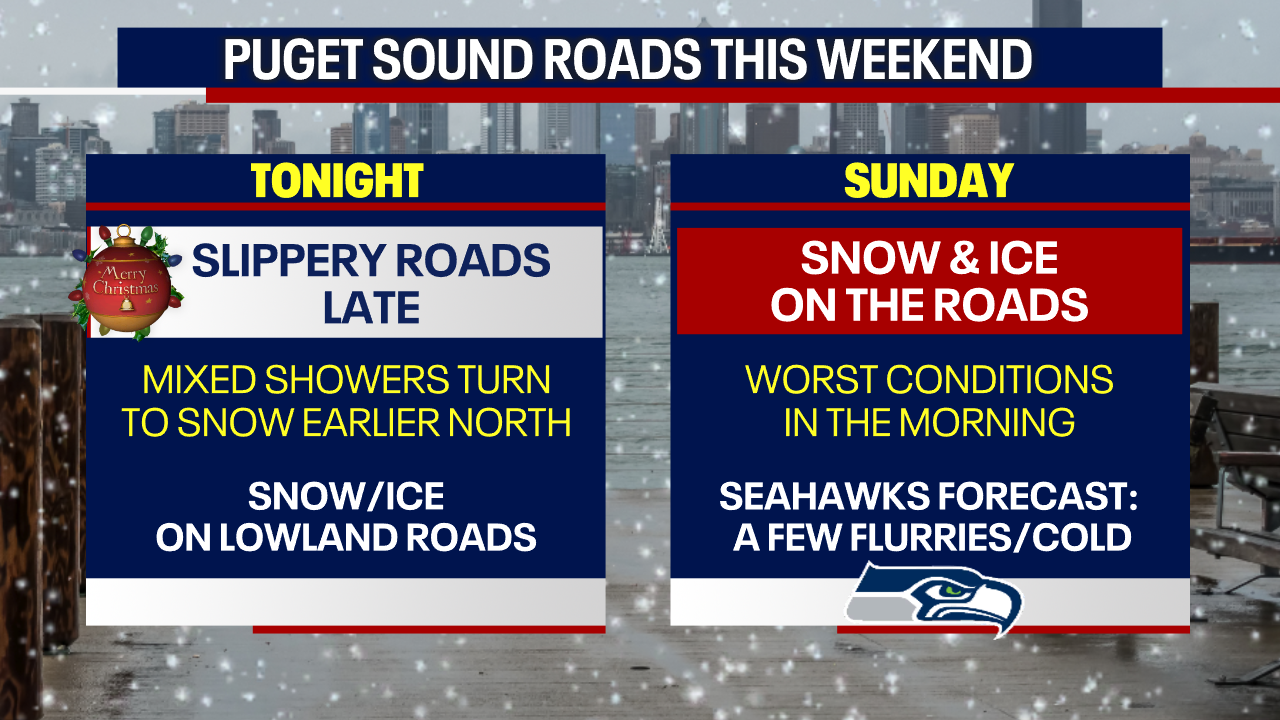 Spotty snow showers around the state will continue into the overnight hours before wrapping up Sunday. And just as the snow started to fall for folks in the North Sound Christmas night temperatures took a quick dive into the teens and twenties. The combination will make for an interesting situation for holiday travelers Sunday into the first part of next week.