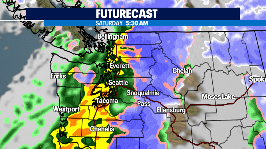 - Early Saturday morning, heavy snow could change over to freezing rain at Snoqualmie Pass as a warm front pushes through the area. This would severely impact travel conditions over I-90. Freezing rain is much more dangerous than snow.