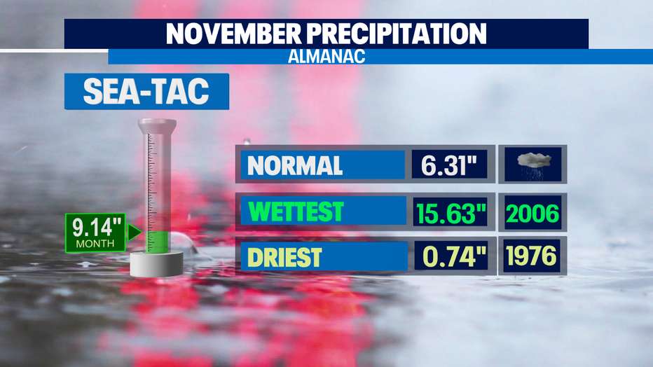 So just how much rainfall does SeaTac have in the bucket now? Well over 9+ inches and climbing. The record for November is 15.63" set back in 2006. With only three more days left in the month it looks like we won't quite get to record breaking territory at the airport, but it will be close as we see widespread rain through early Monday.