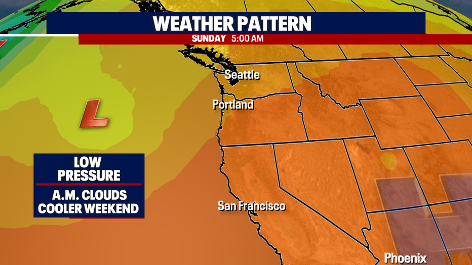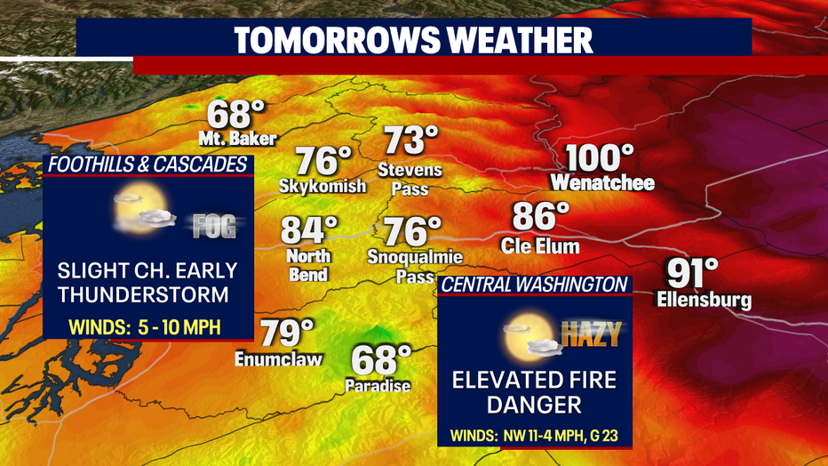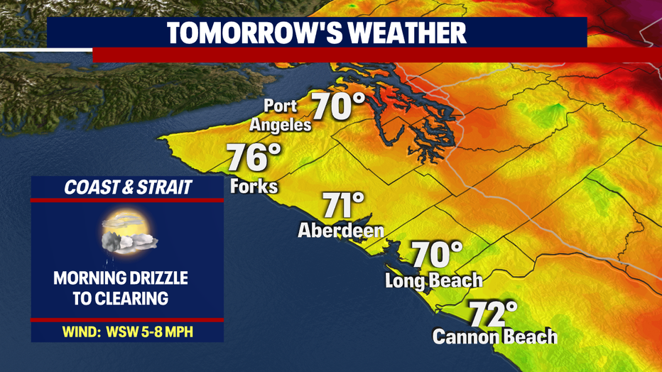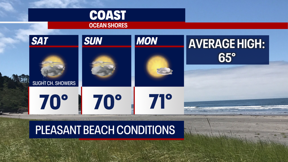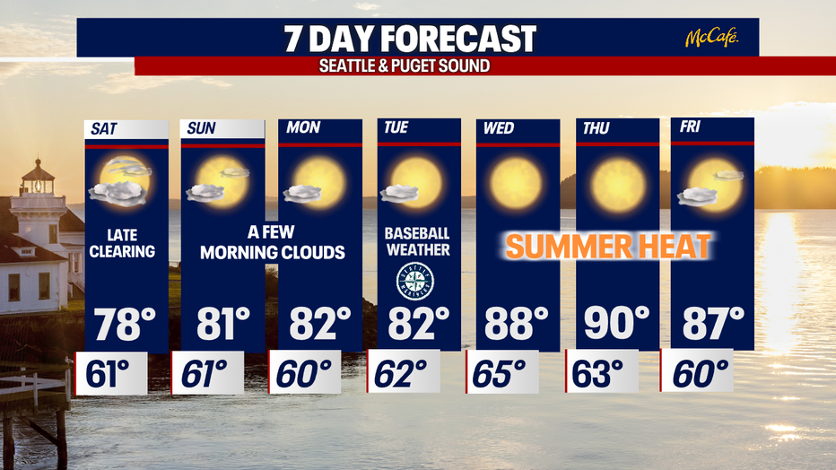 We're mostly cloudy out of the gate with late afternoon clearing today. Highs will warm into the upper 70s for the North Sound with close to 80 for the Central and South Sounds. The warmest areas this weekend are the foothills with temps in the mid 80s.