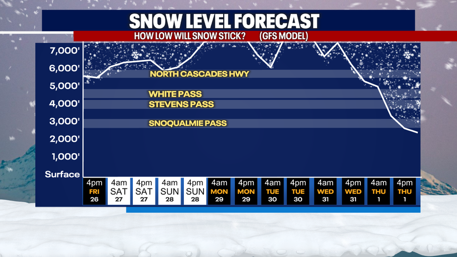 Snow levels will be high over the next several days, well above the passes. Mild wet weather will bring a potential for significant snow melt and rising rivers into early next week. We will be watching the river levels closely.