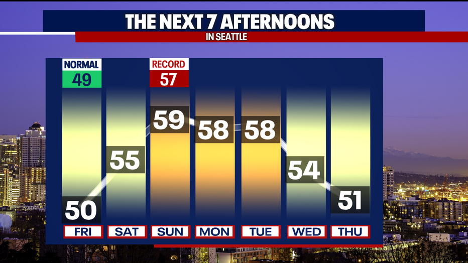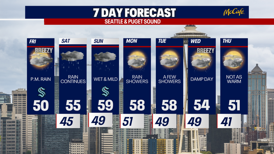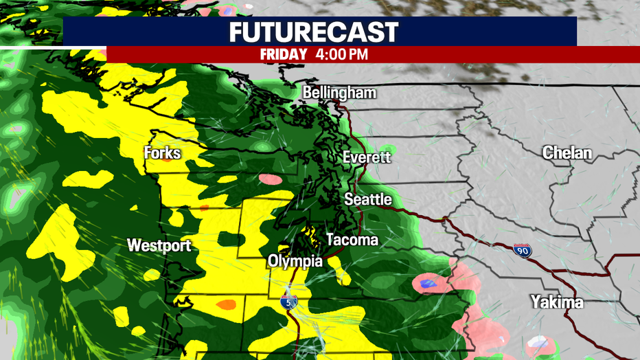 SEATTLE - A weak atmospheric river will push into Western Washington Friday, bringing moderate to heavy rain at times Friday night into Saturday.