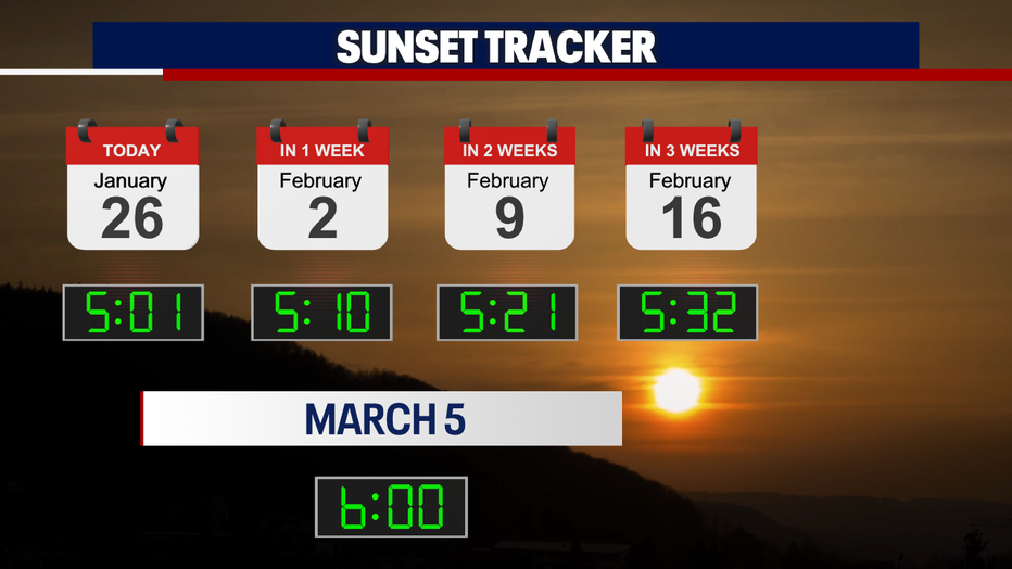 We are breaking out of the "Big Dark." Tonight will bring the first sunset after 5:00 PM of the year. By March 5, sunsets will be after 6:00 PM.