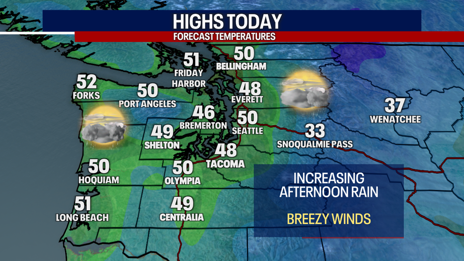 Most of the daylight hours will be dry for the Puget Sound area Friday, with widespread rain hitting the area around the evening commute.