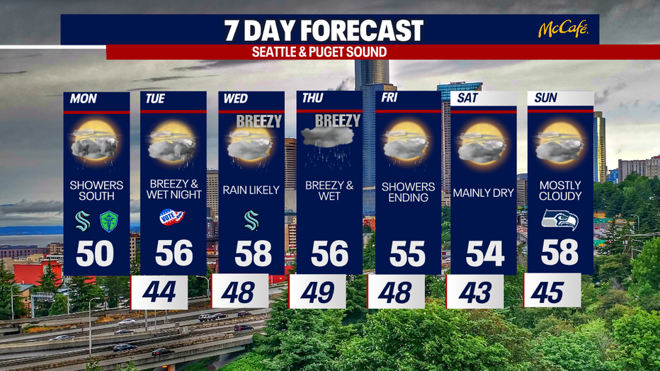 Light showers are moving into the Puget Sound area from southwest Washington. Areas north of Seattle will stay mainly dry Monday, with most of the action south of the city. High temperatures will be cool, only around 50 degrees.
