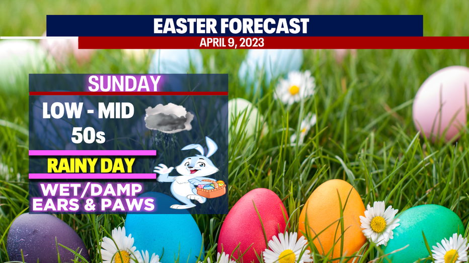 Sunday is going to be a bit soggy at times as the next weather maker arrives just in time for the Easter Bunny. And unfortunately, these conditions are not helpful for backyard egg hunts. Highs land in the low to mid 50s.