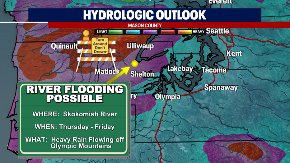 With so much rain falling over the Olympics we're keeping a close eye downstream at the Skokomish River in Mason County. Mountain runoff into the Skokomish could cause a sharp rise in river levels through Friday for minor flooding.