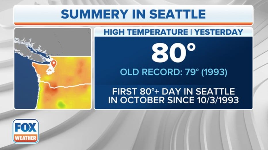Seattle hit 80 on Sunday – its first 80-degree reading in October since 1993. Monday is forecast to make it two in a row, and it would be the first time in the Emerald City that October has featured two days in the 80s.