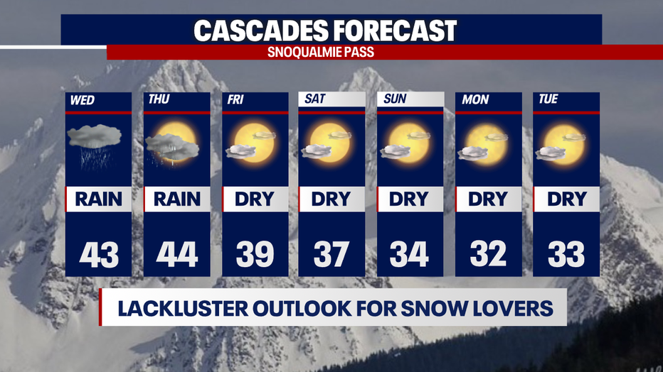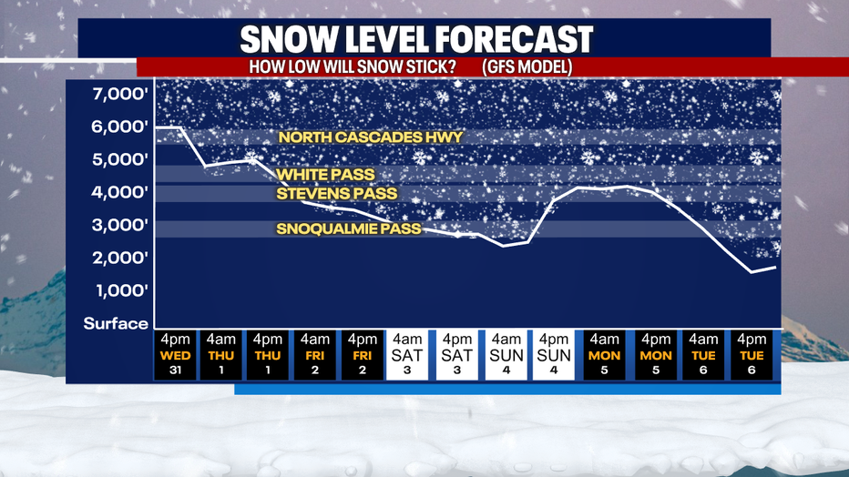 Snow levels will remain above the passes Wednesday with about .25 to .50 inches of rain expected in the Puget Sound lowlands over the next two days.
