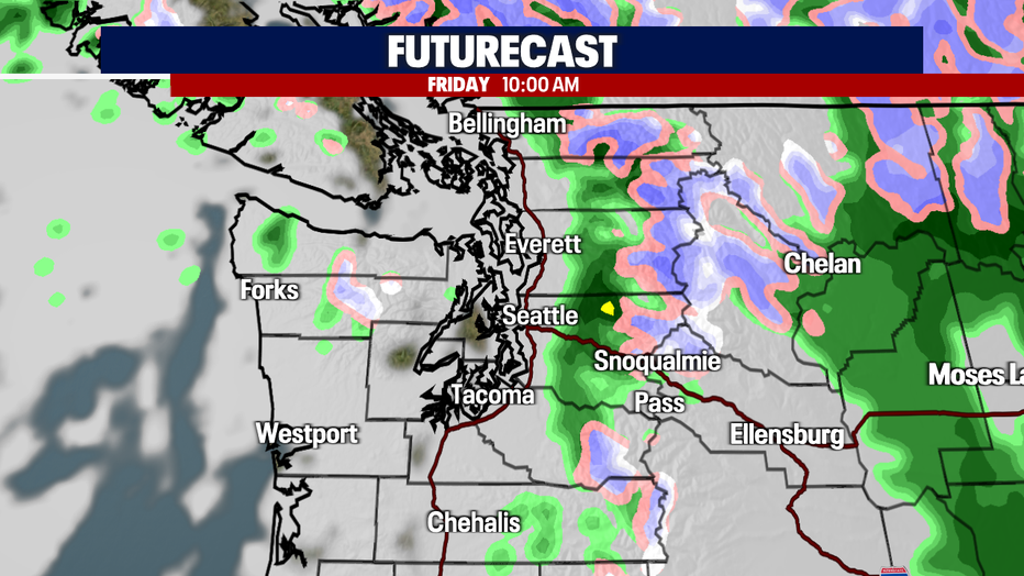 By late Friday morning, the rain will move on from the lowlands, bringing a mix of clouds, sunshine, and much drier weather to the Puget Sound area by Friday afternoon.