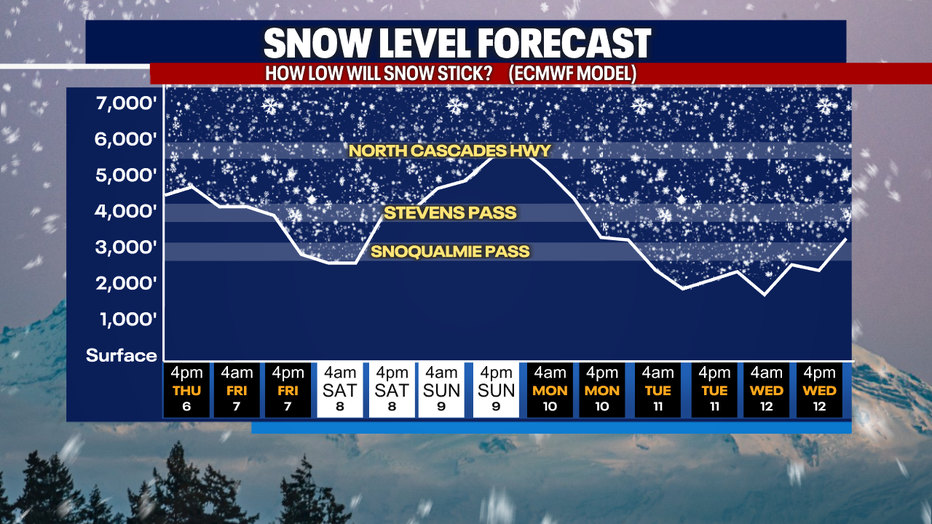 Snow levels will remain above the Cascade passes today and for our next big event on Sunday. This means, the higher elevations will continue to see snow, but pass travel will be wet, not snowy.
